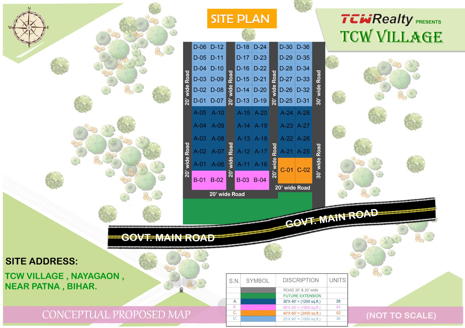 "TCW VILLAGE " PROJECT DETAILS ? PROPOSED PROJECTIIN AREA 3.9 BIGHA . ?ROAD 20 FT ?PLOT SIZE 25X40= 1000 SQFT 30X40 =1200 SQFT 40X45 =1800 SQFT ? Agreement Within Two Month Mendatory . ?PEYMENTS PLAN PLAN 1 One Time Booking Plan ??????? ?Rate - 999/- PSQFT (One time Booking With in Month ) ?BOOKING AMOUNT RS 2,40,000/-VALID FOR 15 DAYS ONLY . ?Agreement on 100% Full Payment . ..... .. ...प्लान -2.............. 6 Month Booking Plan ???????? ?Rate - 1055 /- PSQFT (Payment WithIn 6 Month ) ?BOOKING AMOUNT RS 2,40,000/-VALID FOR 15 DAYS ONLY . ..... .. ...प्लान -3.............. 12 Month Booking Plan ???????? ?Rate - 1155 /- PSQFT (Payment WithIn 12 Month ) ?BOOKING AMOUNT RS 2,40,000/-VALID FOR 15 DAYS ONLY . ..... .. ...प्लान -4.............. 18 Month Booking Plan ???????? ?Rate - 1255 /- PSQFT (Payment WithIn 12 Month ) ?BOOKING AMOUNT RS 2,40,000/-VALID FOR 15 DAYS ONLY . ? Ag